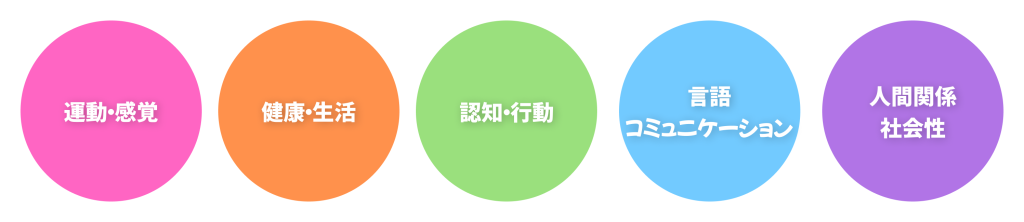子どもが将来的に自立し社会生活を送るために必要な「健康・生活」「運動・感覚」「認知・行動」「言語・コミュニケーション」「人間関係・社会性」という5つの発達側面を網羅した包括的な支援枠組みです。